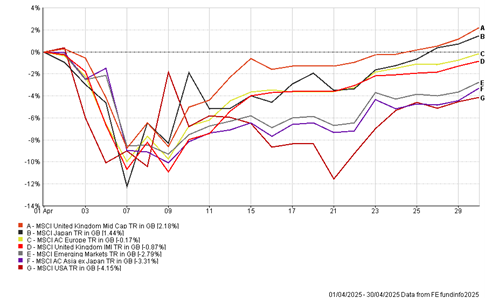 Global equity markets had a difficult start to April but rebounded strongly after the initial fallout from Trump’s Trade War on the rest of the world. The performances of the main equity indices are highlighted below: