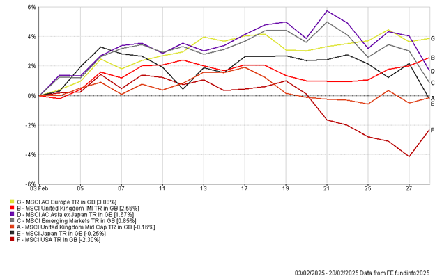 US equities fell over the month, as investors became concerned about the sustainability of economic growth. Recent data by the Conference Board showed that consumer confidence declined at the fastest pace since 2021, while consumer inflation expectation levels rose to the highest level since 2023.