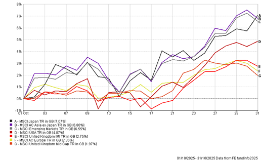 Japan elected Sanae Takaichi as its first female Prime Minister this month, which boosted markets given her pro-growth stance, promising fiscal stimulus, investment in AI and semiconductor sectors, and structural reforms. This triggered a wave of optimism among domestic and foreign investors, fuelling equity inflows. Japanese tech giants like Advantest and Tokyo Electron posted strong earnings and raised guidance, as investors piled into semiconductor and AI-related stocks, driving the Nikkei 225 up +15% its best monthly gain in 30 years. A softer yen improved competitiveness for exporters (autos, machinery), lifting earnings expectations and the continued accommodative stance from the BoJ supported risk appetite and equity valuations.